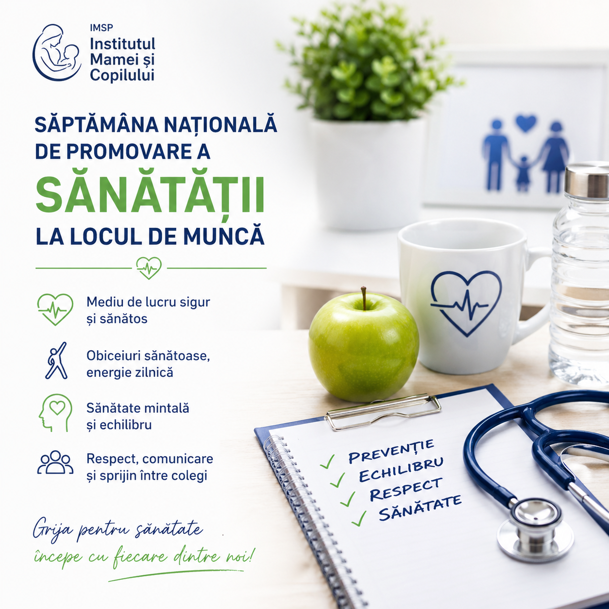 În această săptămână dedicată sănătății la locul de muncă, IMSP Institutul Mamei și Copilului reiterează importanța unui mediu profesional sigur, echilibrat și favorabil bunăstării fizice și emoționale.